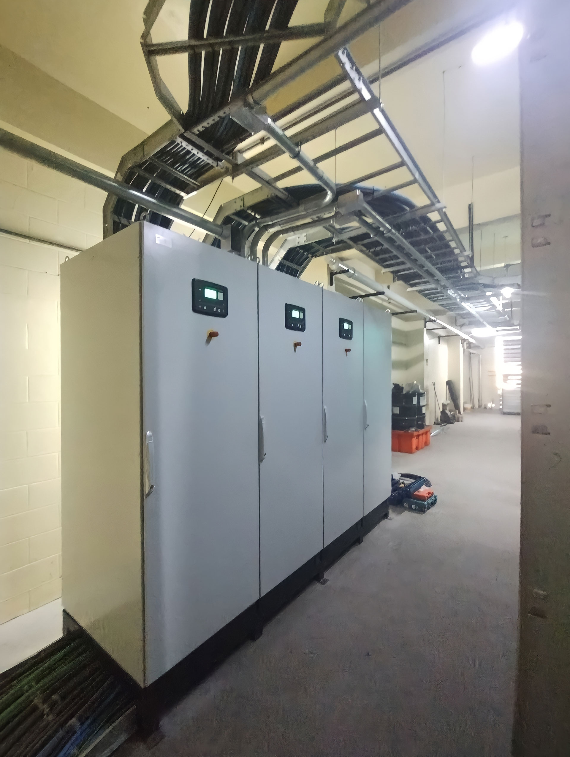 Também construímos e instalamos o painel de paralelismo e realizamos o retrofit dos painéis de transferência automática, modernizando a estrutura elétrica da planta.